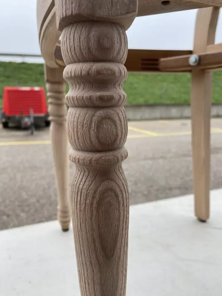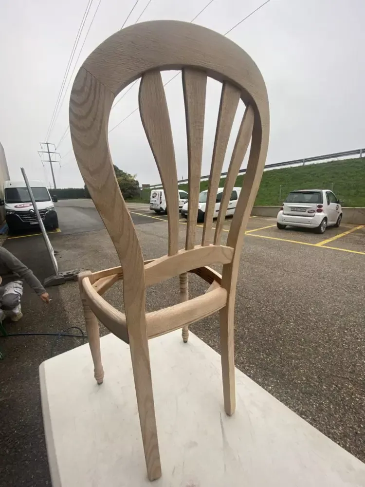 Sur ces chaises en frêne massif, nous avons démonté les placets (assises), puis décaper la surface du bois par aérogommage pour retrouver la couleur du bois d’origine. Nous avons ensuite appliqué un traitement de protection non-pelliculaire qui laisse apparaître la profondeur du veinage du bois et ainsi, son charme.
