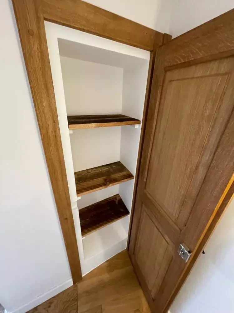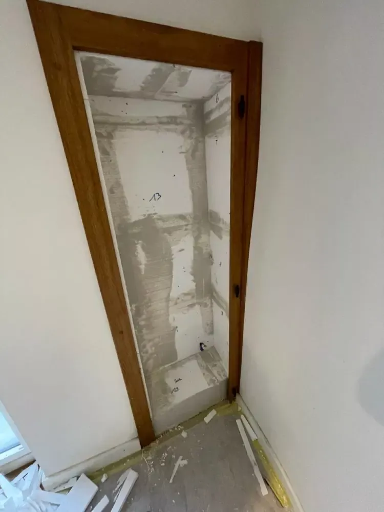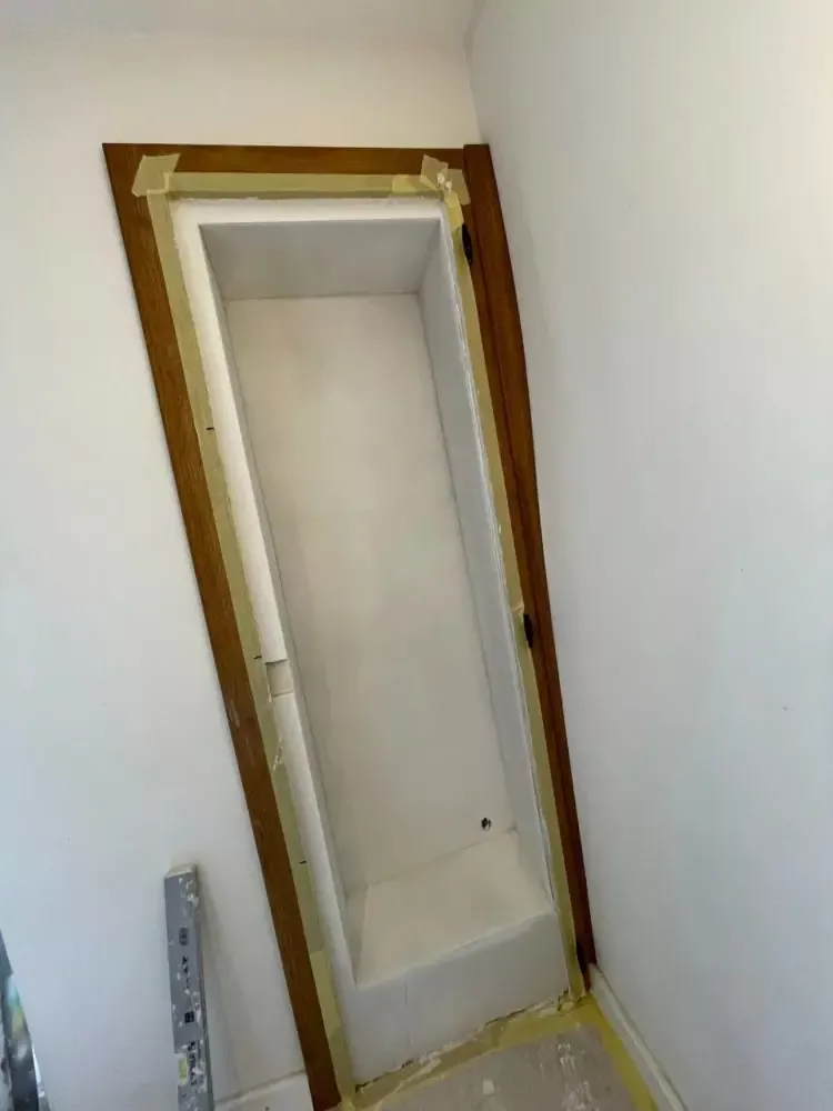 Une armoire qui n’est pas isolée dans une vieille bâtisse et c’est toute une pièce voir plus qui est refroidie et surtout qui peut amener de la moisissure, donc contrôle avec notre testeur de température laser. Nous avons donc isolé l’ensemble de l’intérieur de l’armoire avec des isolants avec un bon indice thermique. La pose de profils d’angles pour renforcer les arêtes et un lissage de finition pour obtenir une surface propre prêt à recevoir une peinture blanche pour amener de la clarté.