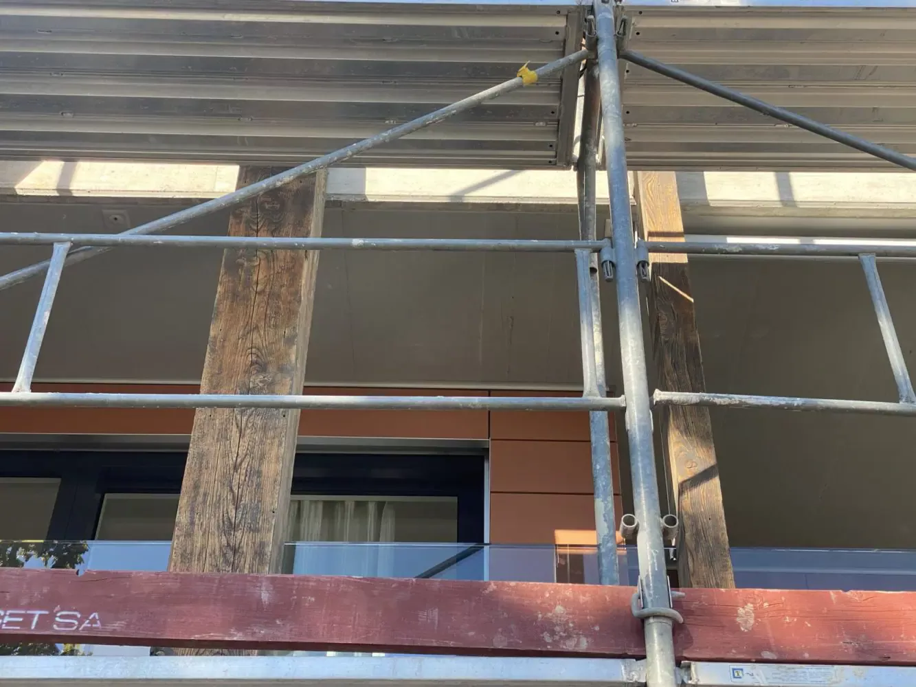 Rénovation en glacis de cette ancienne charpente de ferme réhabilité en un immeuble de village. Notre travail pour la réalisation de ce projet a été un ponçage manuel et mécanique de la surface du bois, un traitement de fond et d’une finition mat-satin afin de garder l’aspect bois ancien sur cet immeuble contemporain.