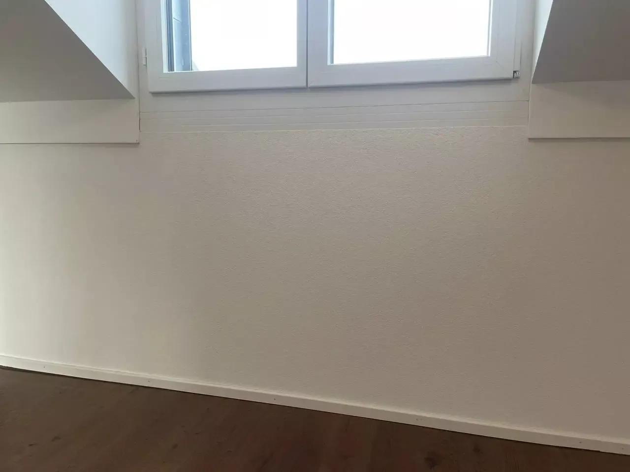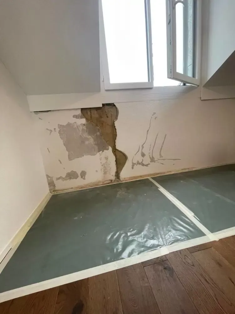 Sur ce contrecœur, une infiltration d’eau par la ferblanterie en toiture a laissé s’infiltrer de l’eau de pluie qui a détérioré le mur de façade côté intérieur du logement. Nous avons dans un premier temps laissé sécher le mur après réparation de la fuite, nous avons exécuté un crépi de fond ciment et un lissage au plâtre avant de réaliser le crépi synthétique décoratif en finition.