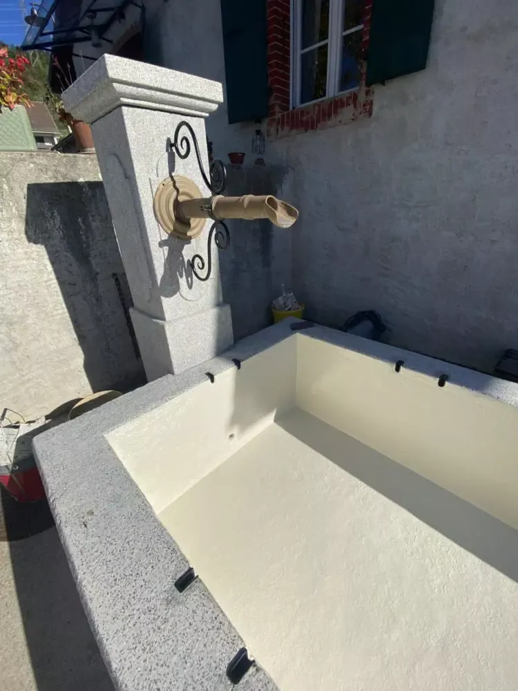 Rénovation d’une ancienne fontaine de village en pierre, travaux comprenant le sablage complet de la pierre extérieure et intérieure du bassin, traitement du métal par thermolaquage, et nous avons traité l’intérieur avec une résine en 4 couches.